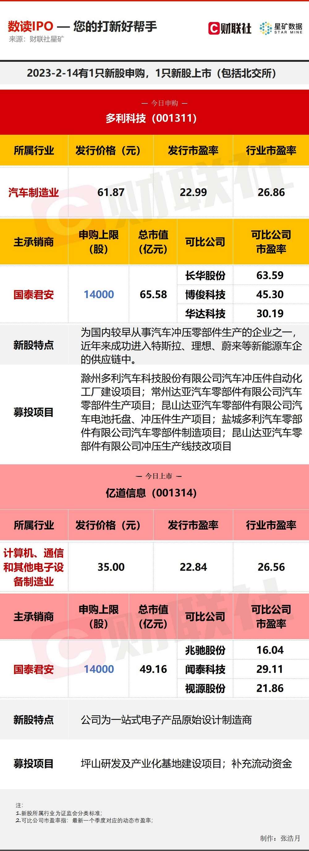 财联社2月14日讯,今日1只新股申购,为深交所的多利科技;1只新股上市,为深交所的亿道信息。